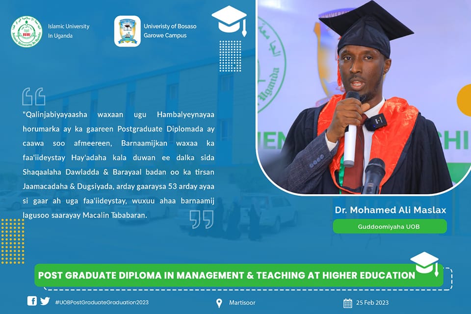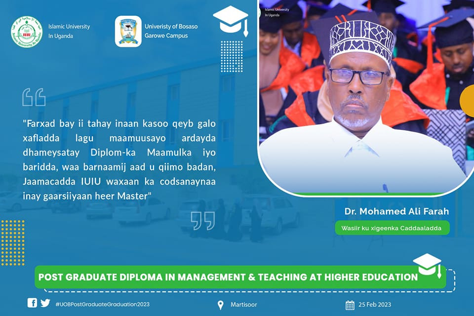 Qayb ka mid ah Arday dhameysay Kulliyadda Shareecada ee Jaamacadda Bosaso Garowe ayaa Kulan mahadcelin ah u sameeyay Macallimiintooda iyo maamulka Jaamacadda. University of Bosaso – Garowe