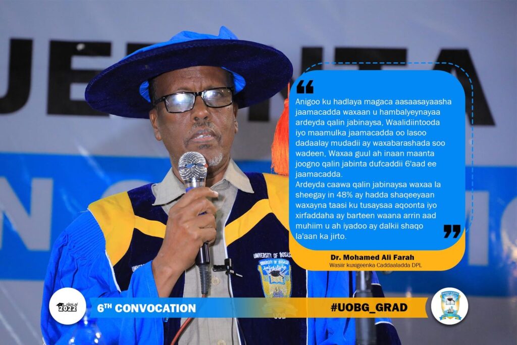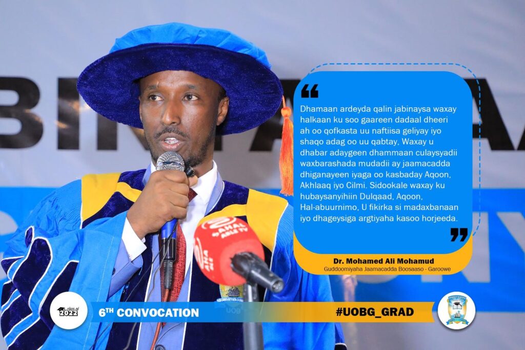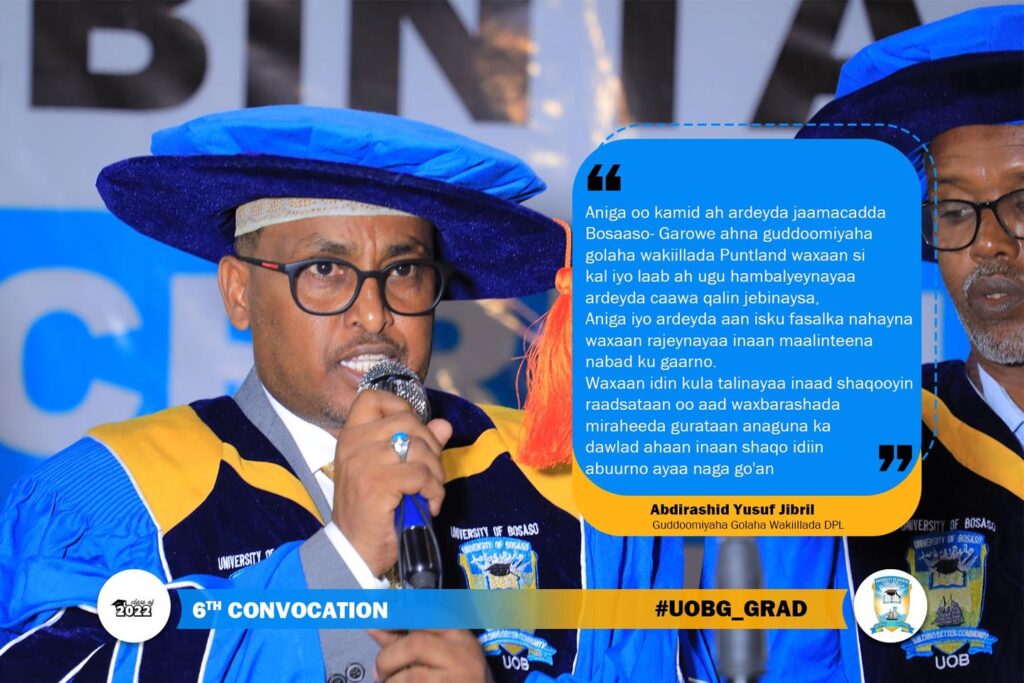 Guddoomiyaha Jaamacadda Bosaaso- Garowe Dr Mohamed Ali Mohamud: “Dhamaan ardeyda qalin jabinaysa waxay halkaan ku soo gaareen dadaal dheeri ah oo qofkasta uu naftiisa geliyay iyo shaqo adag oo uu qabtay, Waxay u dhabar adaygeen dhammaan culaysyadii waxbarashada mudadii ay jaamacadda dhiganayeen iyaga oo kasbaday Aqoon, Akhlaaq iyo Cilmi. Sidookale waxay ku hubaysanyihiin Dulqaad, Aqoon, …